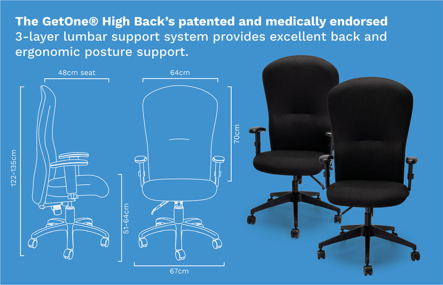 Our GetOne® High Back office chairs are designed with your body in mind and offer support for all shapes and sizes. The patented 3-layer foam system maintains constant support of the curvature of the spine. The result? Reduced back pain, improved posture, and greater productivity at your desk.