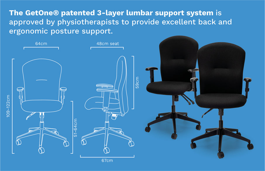 Our GetOne® Mid Back office chairs are designed with your body in mind and offer support for all shapes and sizes. The patented 3-layer foam system maintains constant support of the curvature of the spine. That means reduced back pain, improved posture, and greater productivity at your desk.